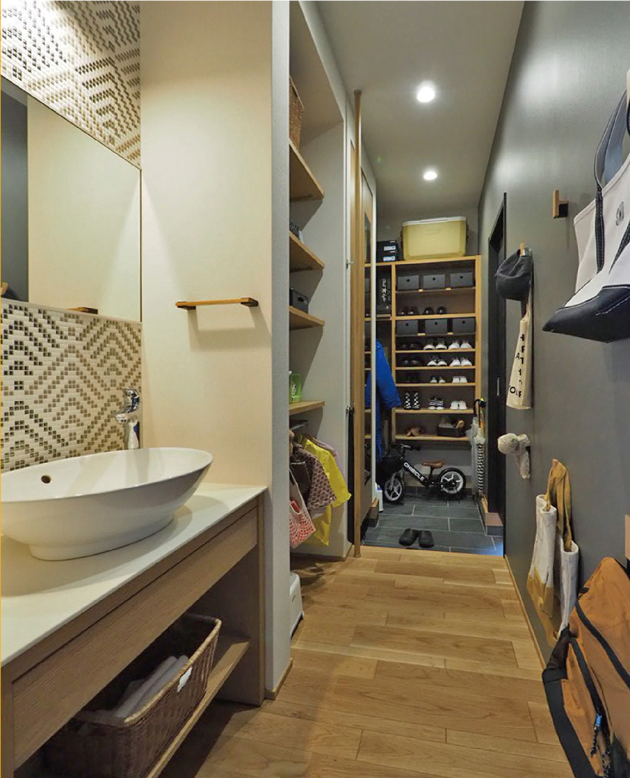 これから住まいを考える人は、洗面室の扉には、開けたままでも大丈夫な引き戸がおすすめです。洗面所の扉を引き戸にしてオープン使いにすると、外出からの帰宅後も直行しやすいです。私自身はこまめに消毒や抗菌をこころがけています。消毒や抗菌のためのスプレーは、ポケットに入るような小さい物をあらゆるところに分散して置いています。家の中、どこにいても1、2歩で手が届き、気づいたときにはすぐに消毒や抗菌ができるためおすすめです。