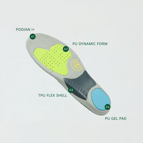 土踏まずを理想的な位置で柔軟に支え、足裏のフィット感を高めます。