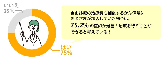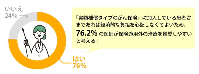「実額補償タイプのがん保険」に加入している患者さまに対しては、保険適用外の治療を推奨しやすいと回答された医師は76.2%となりました。がんゲノム医療において、遺伝子異常に対応する薬や治療法が保険適用外であった場合も、保険適用外部分の治療費も全て補償される「実額補償タイプのがん保険」に加入していれば、治療の選択肢が広がると考えられます。