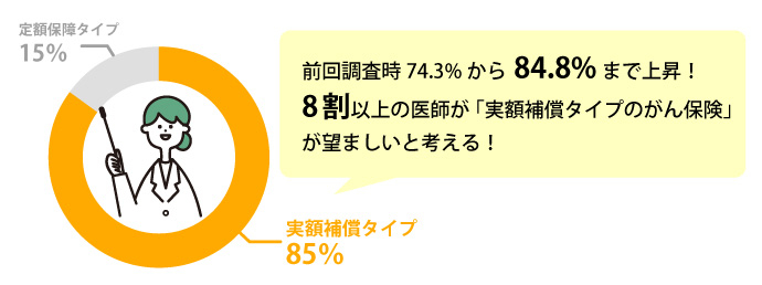 今回のアンケート結果では84.8%の医師が「定額保障タイプのがん保険」より「実額補償タイプのがん保険」の方が望ましいと回答し、前回調査時の74.3%から増加しました。現在、がん保険の主流である「定額保障タイプのがん保険」を抑え、多くの医師が「実額補償タイプのがん保険」を推奨していることが明らかになりました。