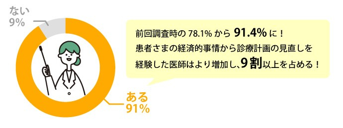 患者さまの経済的事情によりがん診療計画の見直しを行った経験のある医師は、前回調査時の78.1%から大幅に増加し、91.4%となりました。この結果から、がん診療において、患者さまの経済的要素が治療方法などに影響をおよぼしていることがうかがえます。