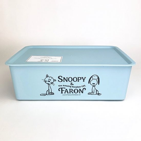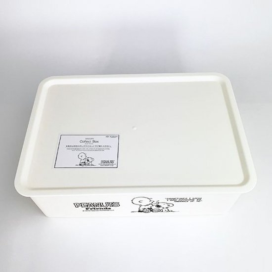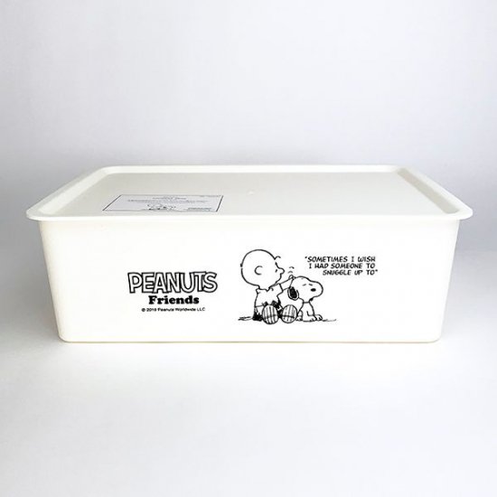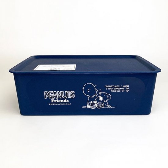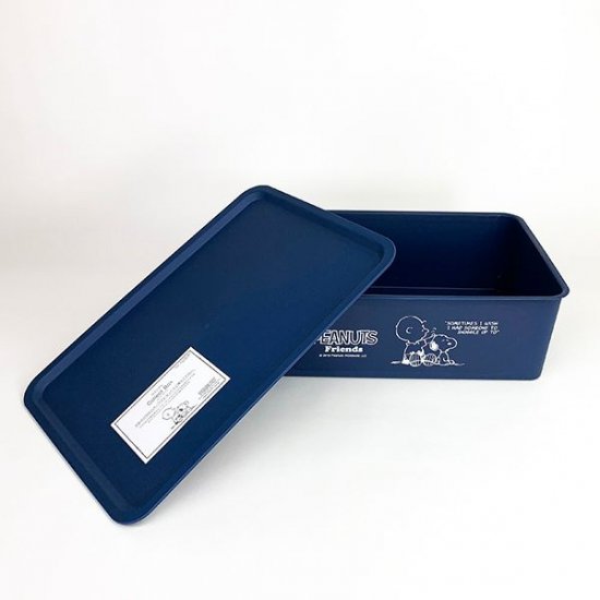 シンプルな長方形の収納BOXです。ネイビーカラーにスヌーピーとチャーリーブラウンの仲良しなデザイン♪フタまでついているので中身も見えず、スタッキングすることもできちゃいます。