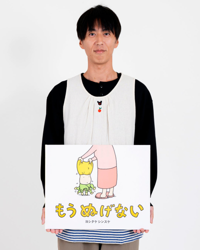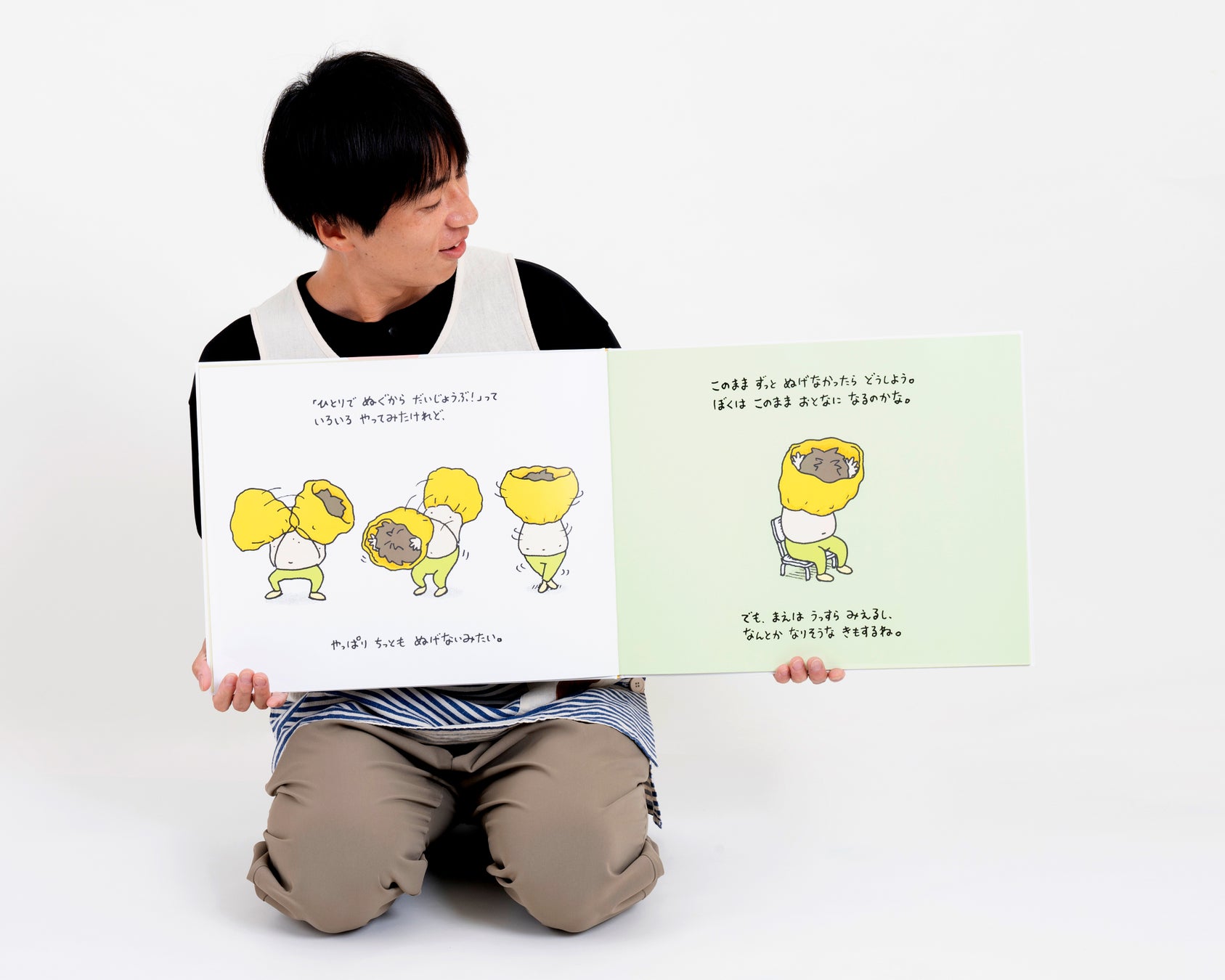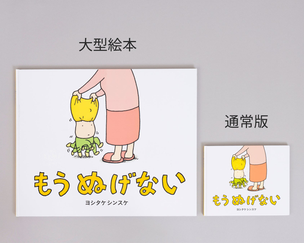 『もうぬげない』は、子どもの「服がひっかかってぬげない」という悩みを、ヨシタケ流のユーモラスな発想で乗り越えるお話です。思わず笑ってしまう展開とかわいらしいイラストが話題を呼び、累計発行部数は73万部を突破しています。刊行から10年を迎える現在も、多くの読者から感想が寄せられ、「おはなし会で読みやすい大きいサイズがほしい」との要望も多数いただきました。この度、皆さまの声にお応えし、大型版を発売します。