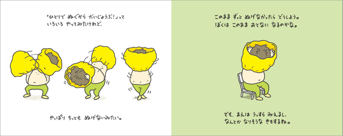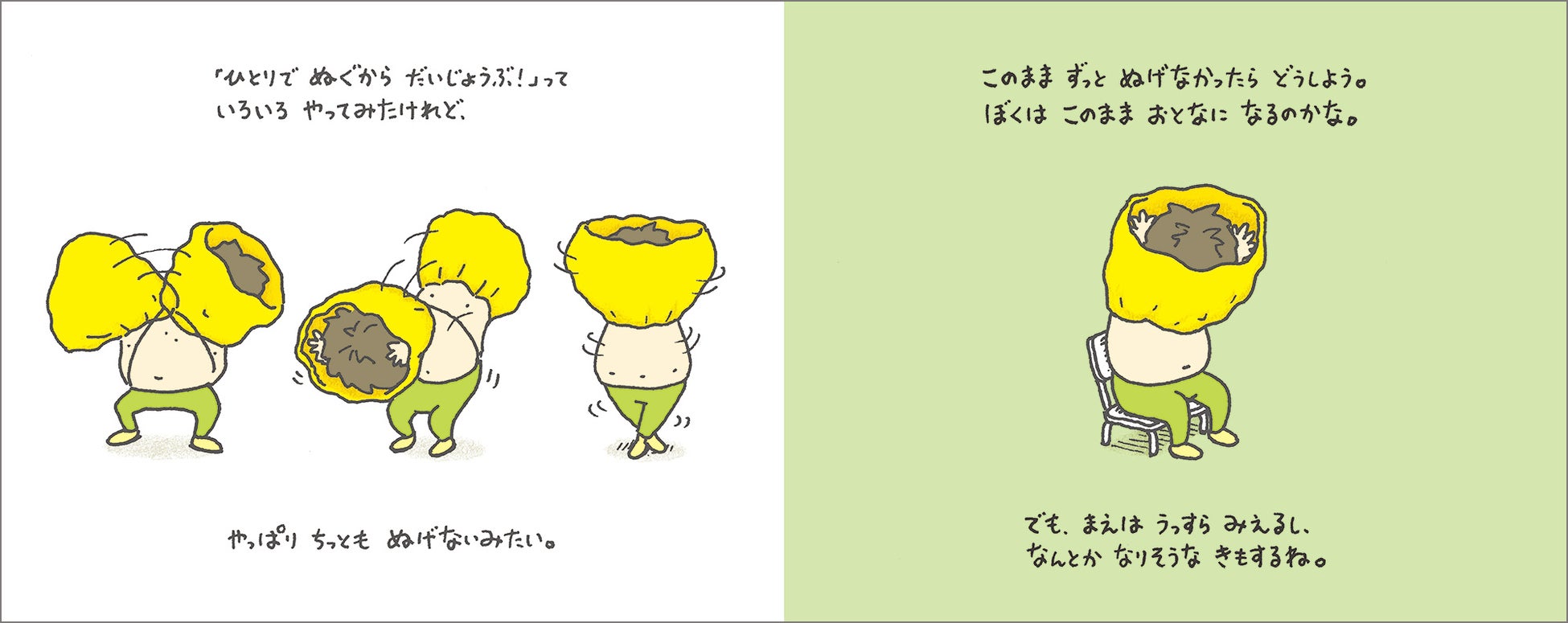 ふくがひっかかってぬげなくなって、もう どれくらいたったのかしら。このままずっとぬげなかったらどうしよう。 このままおとなになるのかな。ぬがないまま、工夫しながら生きる? ぬげない仲間をみつけて、たのしく生きる? あれこれ考えるうち、だんだんおなかがさむくなってきて......