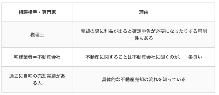 不動産売却には専門的な知識や手続きが必要なため、不動産会社の選択も重要ですが、どのような経験を持った専門家に相談すれば良いかも重要となります。専門家の種類と理由は以下になります