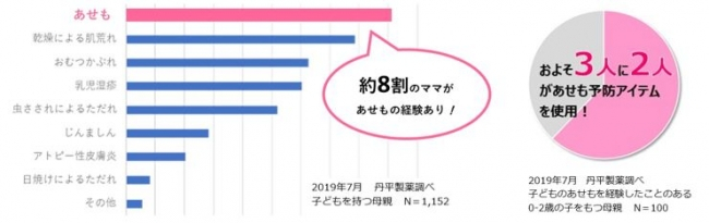 あせも予防のニーズは高く、約8割のママがお子様のあせもを経験し、3人に2人が予防アイテムを使用しているという実態があります。
