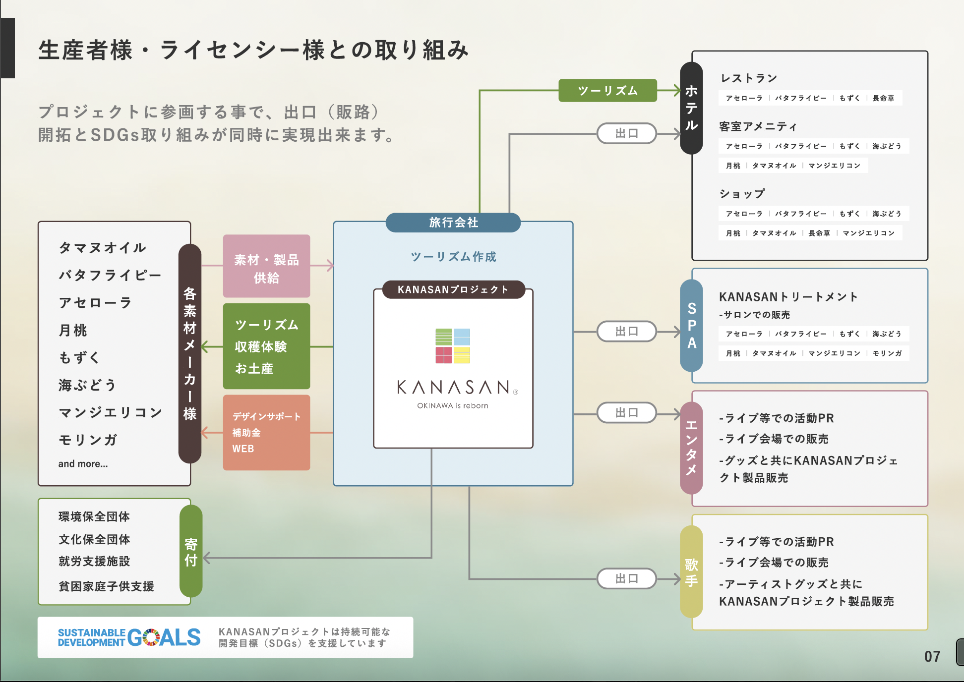 「KANASANプロジェクト」は、「素朴で⾝近で"愛おしい"沖縄のたからさがし」をコンセプトに、沖縄の価値あるモノ・ヒト・コトを「たからもの」として再定義し、新たな価値を創造する取り組みです。豊かな⾃然や⽂化に育まれた産品を、ホテルのアメニティやギフト商品として開発するなど、多⾓的なプラットフォームを通じて、その魅⼒を国内外に発信し ていきます。 また、収益の⼀部は環境・⽂化保全活動や次世代の⼦どもたちの⽀援に還元され、SDGs未来都市としての沖縄の価値向上にも貢献して参ります。