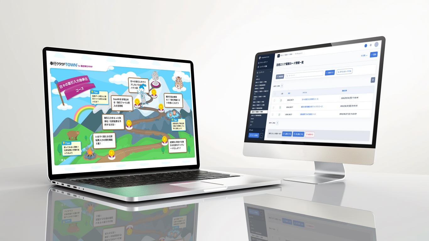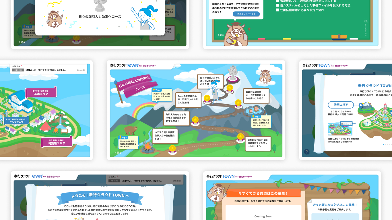 「奉行クラウドTOWN®︎」には、親しみやすいデザインとゲーミフィケーションを取り入れることで、ユーザーは「勘定奉行クラウド」の使いこなしを身につける達成感を味わいながら、年間業務を終了させることができるよう設計しました。
