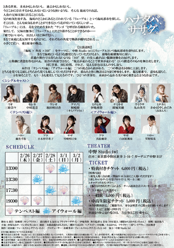 『ハナタバ、ササグ。』が2026年2月26日 (木) 〜 2026年3月2日 (月)に中野Studio twl(東京都 中野区 新井 3-16-7 B1F)にて上演されます。