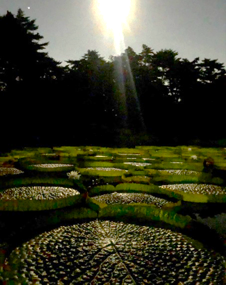 オオオニバスは夜に開き、朝になると閉じてしまいます。当園のつつじ園の池では、例年8月下旬にオオオニバスの花が次々開花し、9月に見ごろを迎えます。月夜に輝く純白の花を、子供が乗れるほど大きく成長した葉とともにご覧いただけます。