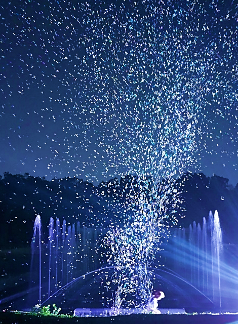 大温室前の噴水をバブルミネーション(シャボン玉とライティングによる演出)が彩ります。夜空に天の川のように浮かぶシャボン玉ときらめく噴水が創り出す幻想的な世界を、夜の神秘的な花たちとともにお楽しみください。