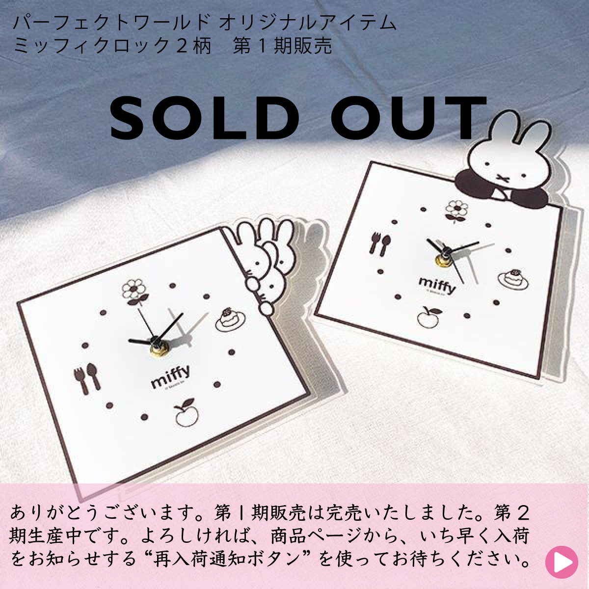アニメ、キャラクターのグッズや企画、オンラインショップを運営する、パーフェクト・ワールド株式会社(本社:東京都葛飾区、代表取締役社長:渋谷厚介)は、2021年2月19日より弊社オンラインショップにて予約を受け付けておりました弊社のプロデュース企画であるミッフィクロックを2種について完売いたしましたことをご報告いたします。