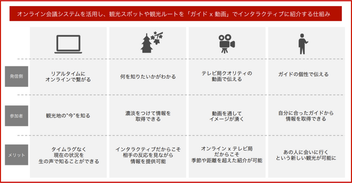 OTTはリアルでの体験を、オンラインにそのまま持ってくるものではありません。時間を超えて「四季の様子を体験できる」、距離を超えて「日本○○三大スポットを短時間で体験できる」など、リアルでは通常味わえないツアーであることが大きな特長です。そして、地方の風習や文化を追体験してもらうことで、withコロナ・afterコロナの誘客に繋げることを目的としています。またEXestのオンライン観光は、地元テレビ局と協力し「ガイド×動画」で実施し、インタラクティブ・コミュニケーション(※1)で実施します。