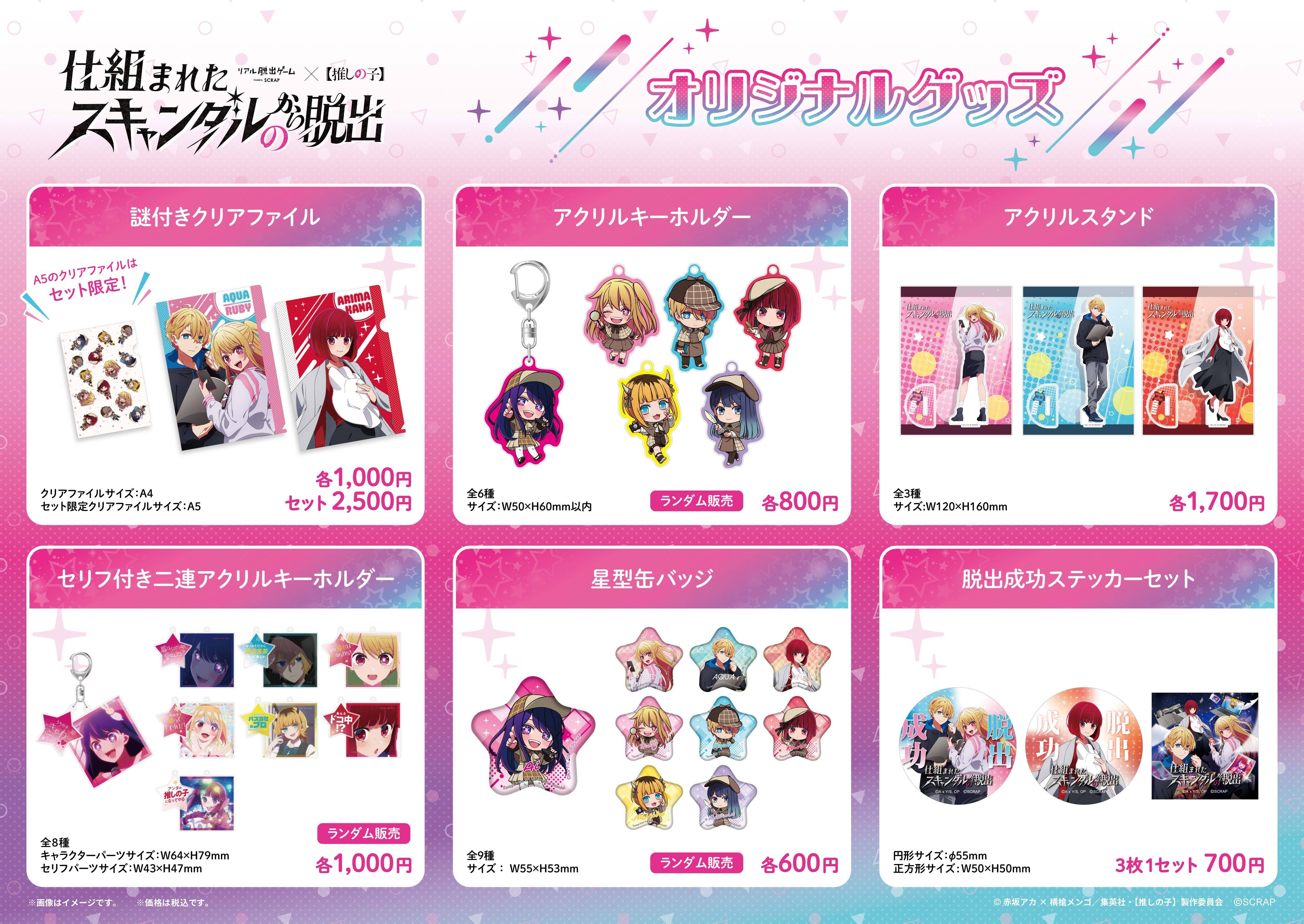 ほかにも、リアル脱出ゲーム×【推しの子】コラボグッズとして、謎解きキットのパッケージとは違う表情の描きおろしイラストを用いたアクア、ルビー、かなのクリアファイルやアクリルスタンドが登場。また、アイやB小町メンバーのほか、アクアやあかねもお揃いの探偵衣装に身を包んだ、星形缶バッジやアクリルキーホルダーをランダム販売! "きゃわ~~~"な"推し"の子を、ぜひ手に入れてください。