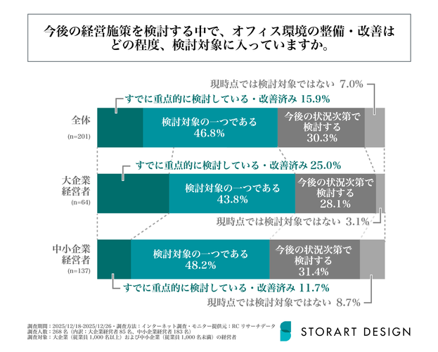 今後、経営施策の中でオフィス環境の整備を検討対象に入れるかという問いに対し、大企業の68.8%、中小企業の59.9%が前向きな意欲を示しています。
