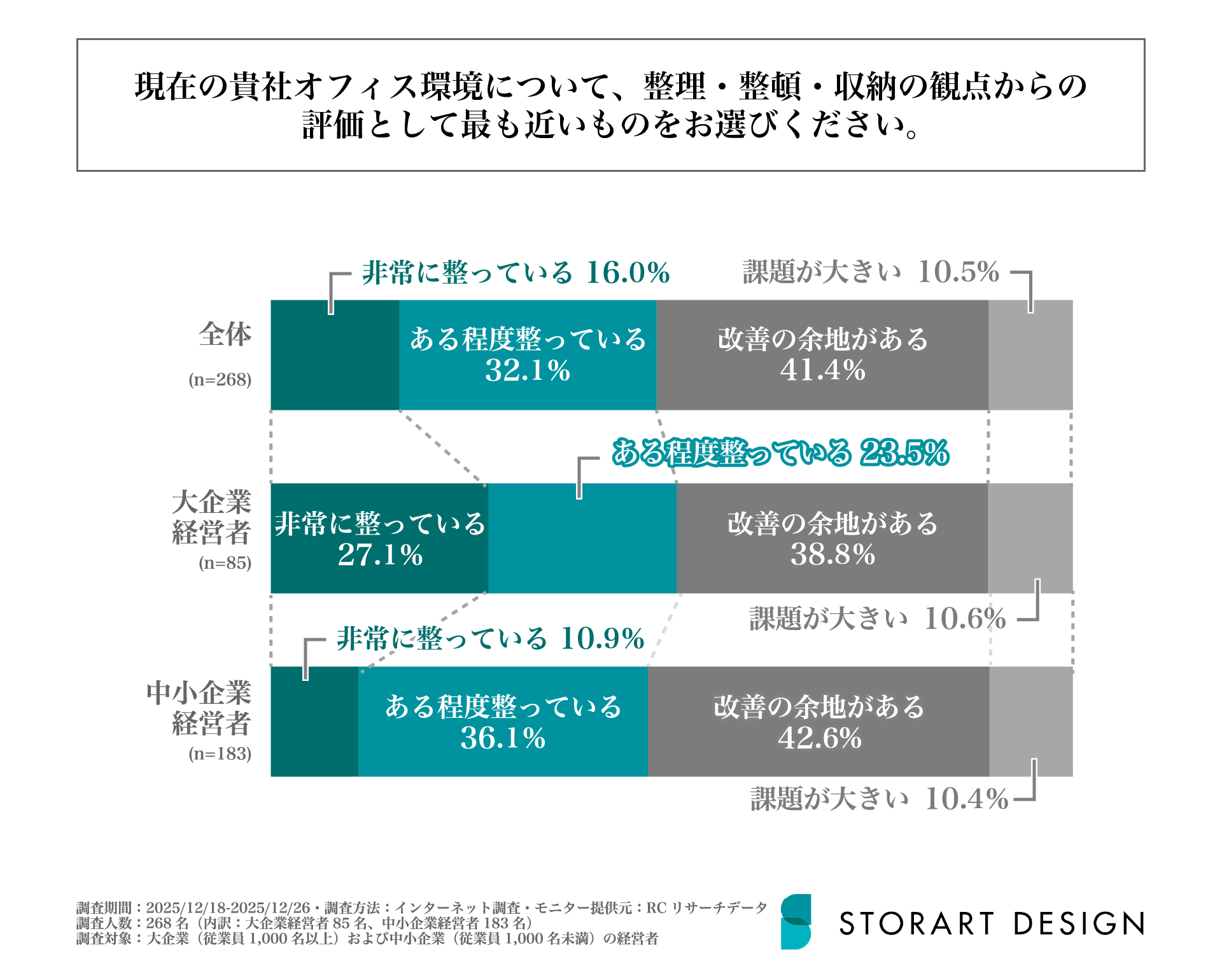 オフィス専門の整理収納コンサルティングを行う株式会社ストラートデザイン(本社:東京都中央区銀座5丁目11番12号 日総第26ビル、代表取締役:大德弘恵)は、大企業および中小企業の経営者268名を対象に「経営者のオフィス環境に対する意識と企業業績に関する実態調査」を実施いたしました。