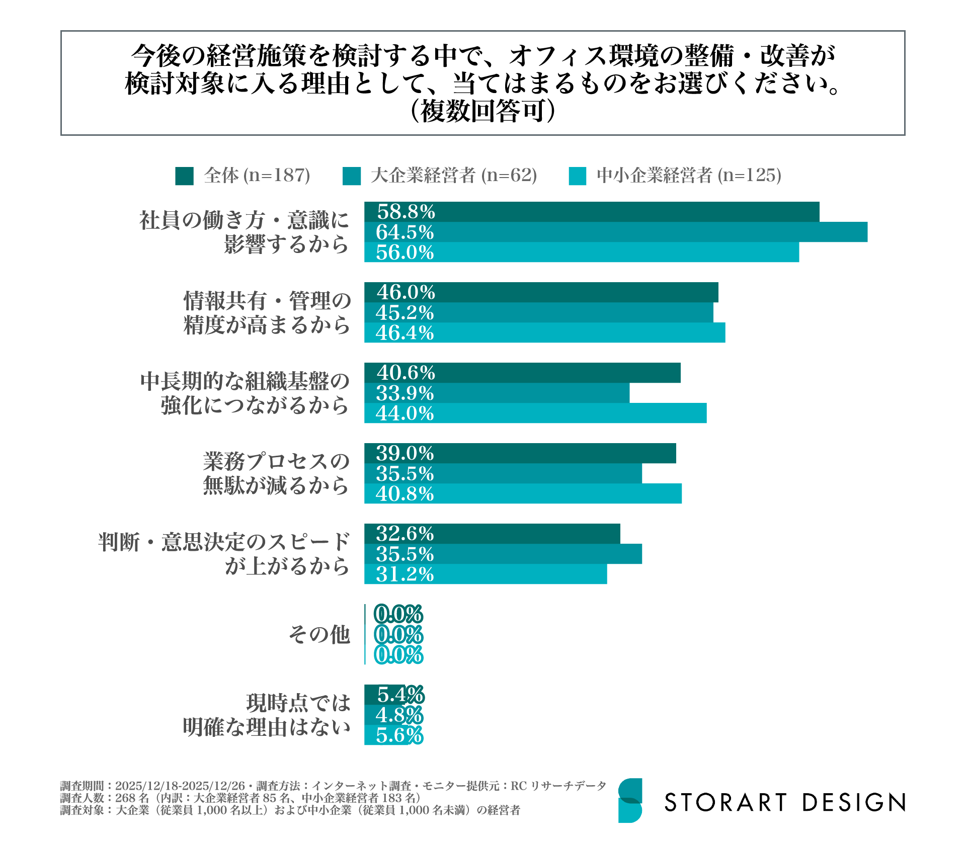 オフィス改善を検討する理由(複数回答)では、企業規模によって戦略的な目的が異なることが分かりました。