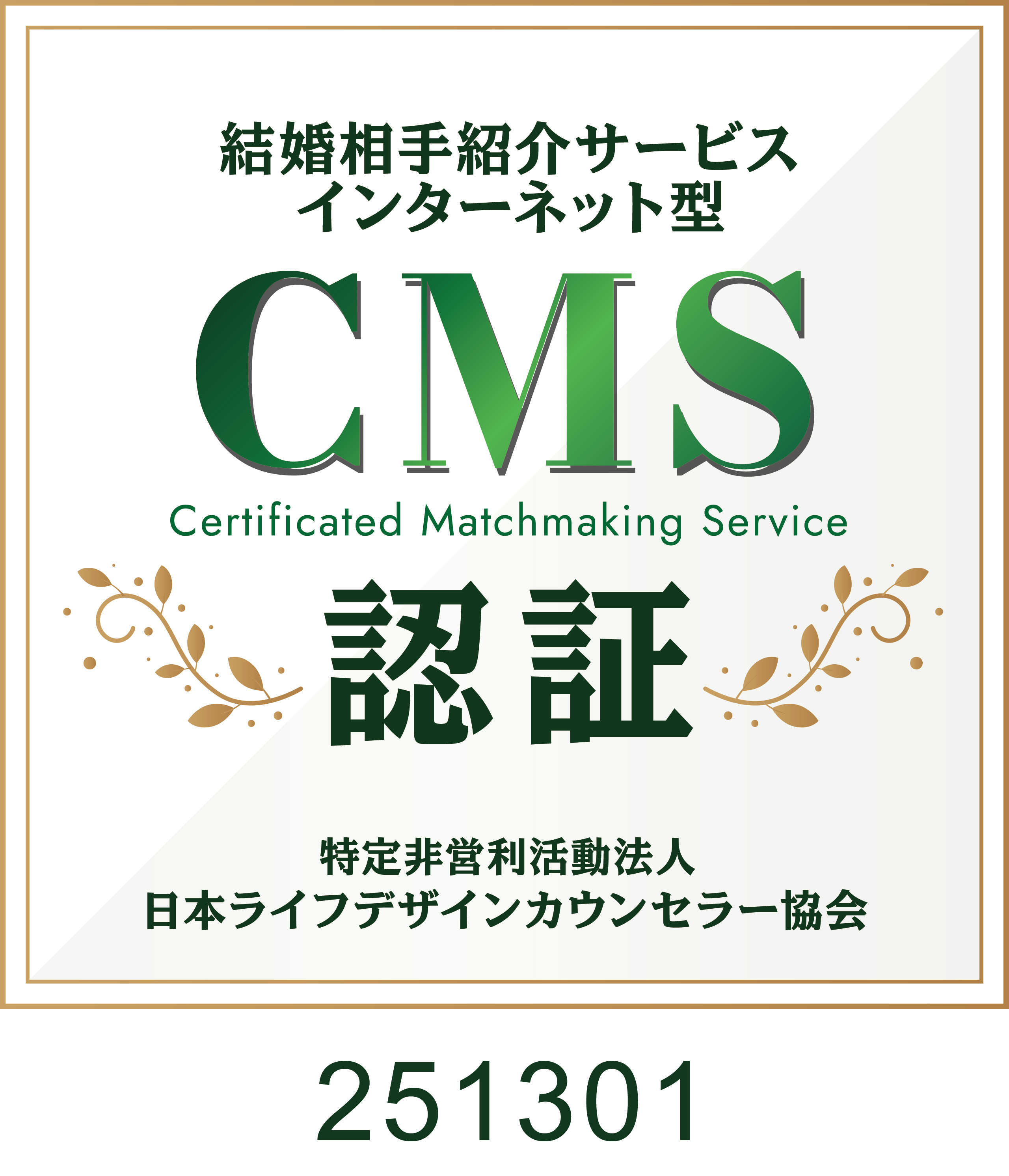 サンマリエでは、長年にわたり結婚支援事業に携わってきた知見を活かし、利用者の皆さまにとって安全で信頼できるサービス提供を最優先に運営体制の強化を進めてまいりました。その取り組みの一環として、第三者による客観的な評価制度であるCMS認証を取得しました。