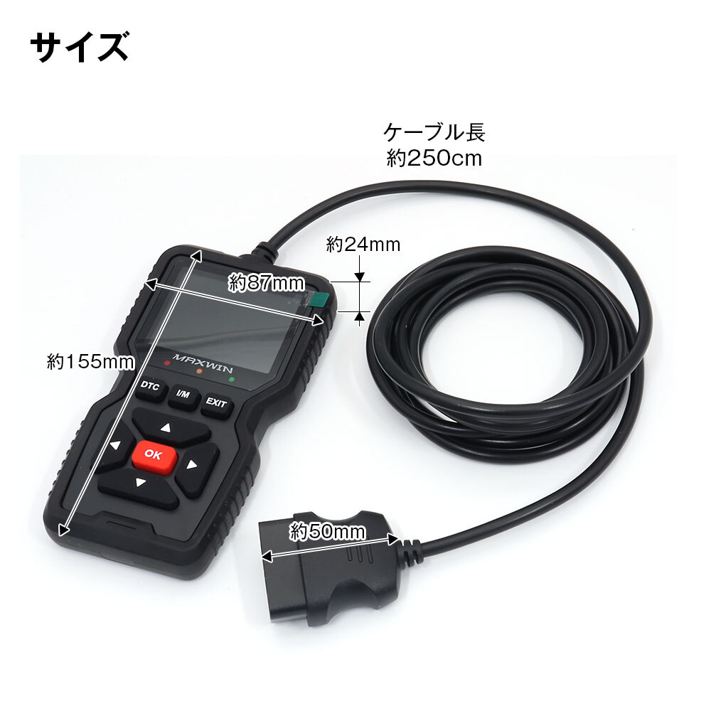 故障コード読み取り・クリア、フリーズフレームデータ読み取り、I/M準備状態、車両情報、データストリームの読み取り、電圧の読み取り、酸素センサーテスト、故障コード照会などをサポートしています。
