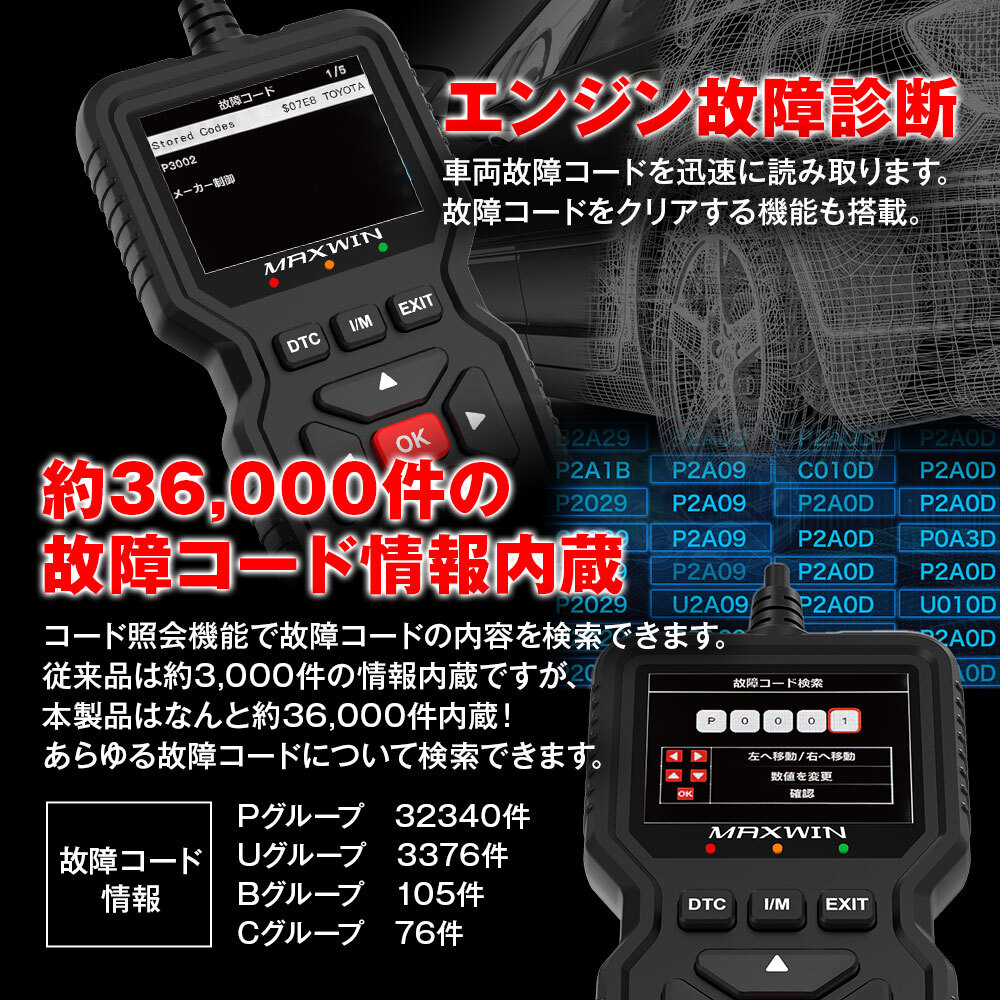 約36000件の故障コード情報内蔵。9つのOBD2/EOBD標準プロコトルに対応。