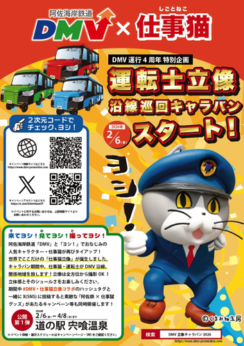 DMV運行4周年特別企画として阿佐海岸鉄道と、「ヨシ!」のポーズでお馴染みの20代〜50代の働く世代を中心に人気のキャラクター「仕事猫」のコラボレーションによる日本初?運転士立像が誕生!その圧倒的立体感とシュールさ?を是非ご覧ください。そして立像設置スタートアップキャンペーンとして、SNS投稿やDMV予約乗車で限定ノベルティをプレゼントなど多数の企画を実施します。