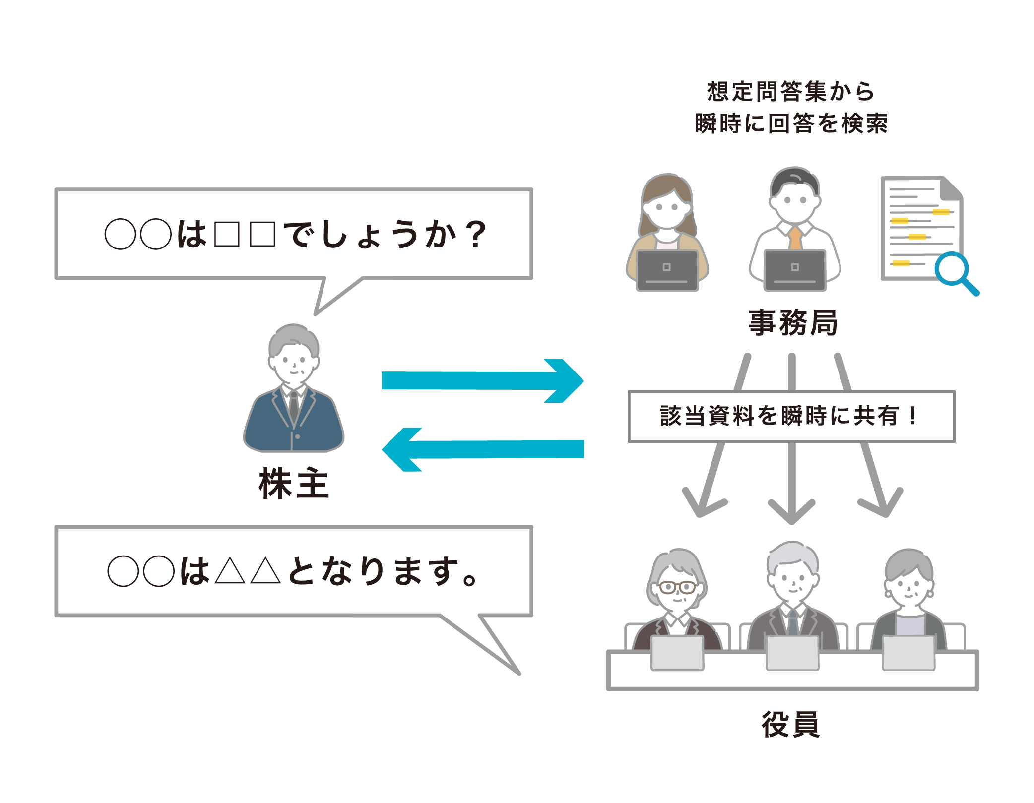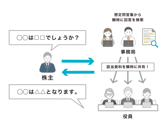 スマートセッションの強力な検索エンジンを利用して株主からの質問も想定問答集から高速に検索、検索後は必要な資料を役員に瞬時に共有でき、役員は共有された資料からスムーズな回答を行うことができます。