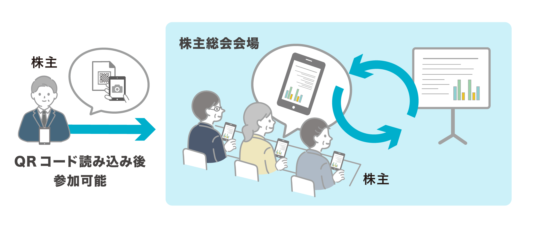 株主等の総会出席者が来場される際、会場に準備したQRコードを読み取ることにより、総会資料を自分のスマホで閲覧することができます。説明資料は手元のスマホで同期されるため、スクリーンから遠い株主にも見やすく資料を共有でき、ホスピタリティを向上させることができます。