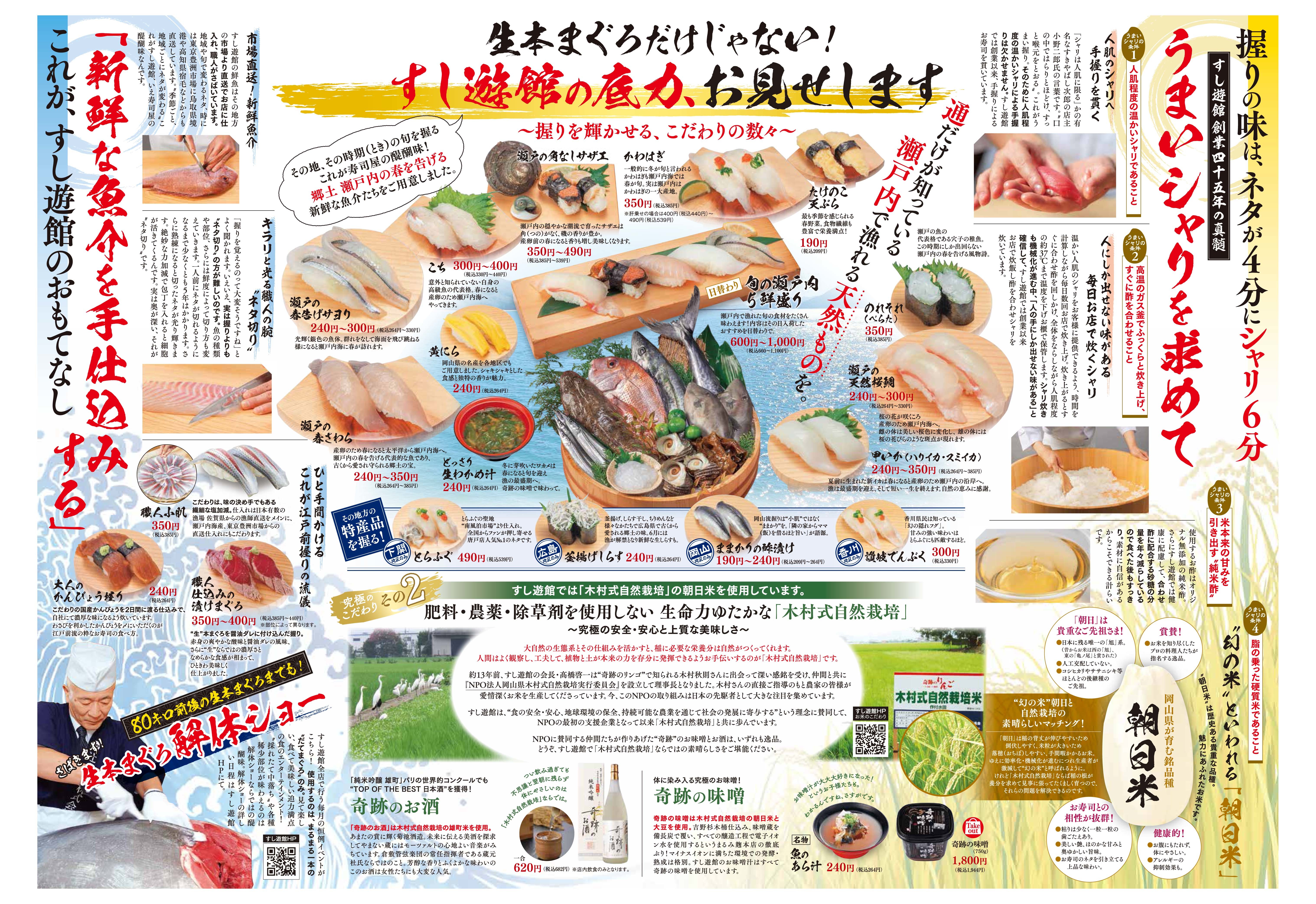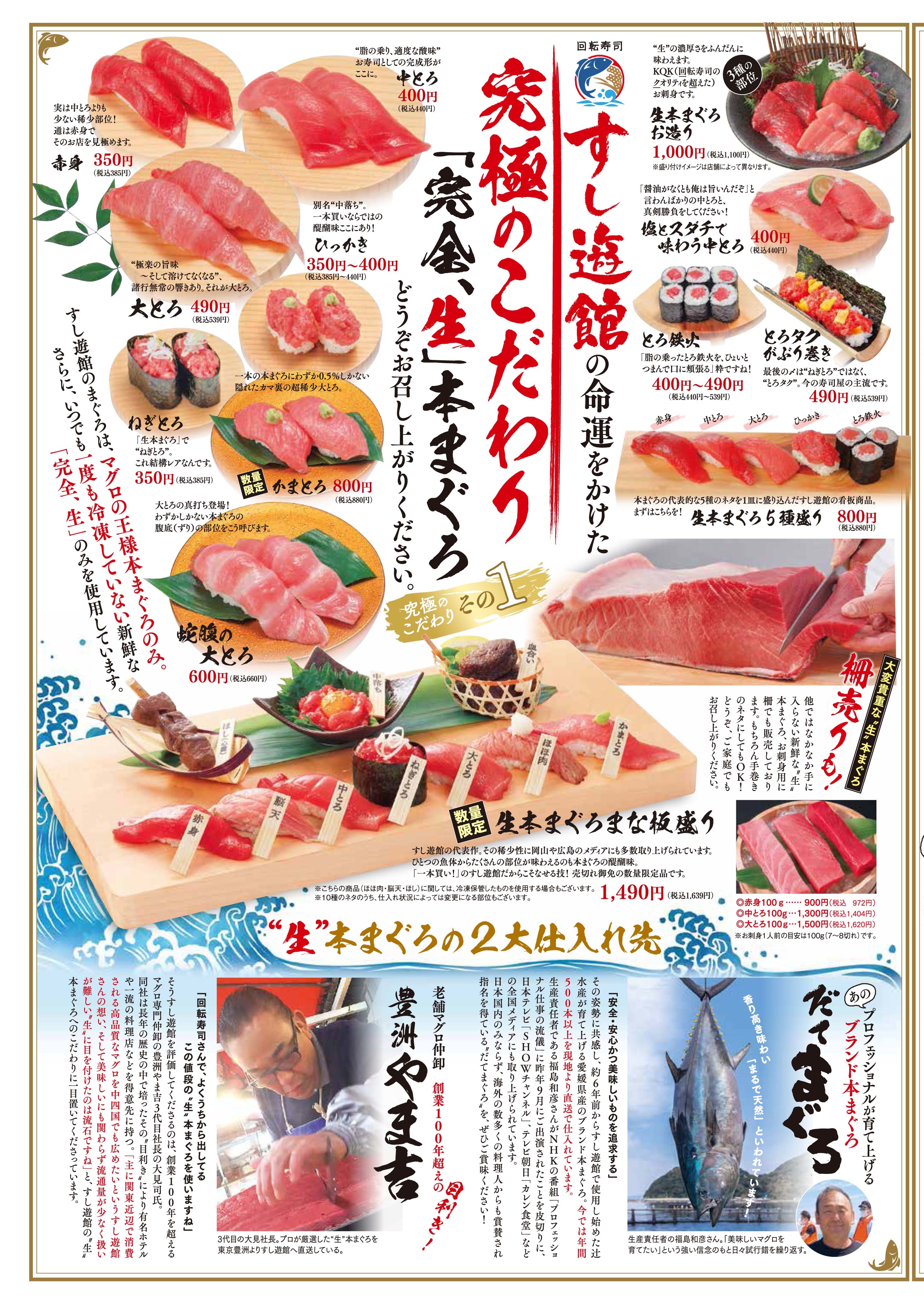 岡山県、香川県、広島県、山口県に合計9店舗を運営している創業45年の回転寿司チェーンです。すし遊館は、人肌のシャリの江戸前握りが信条のお店。お米は、品種改良をしていない脂の乗った硬質米の岡山県産朝日米。「奇跡のりんご」木村 秋則氏の提唱する肥料や農薬、除草剤を使用しない「自然栽培」によって生産されたお米です。そして、自慢のマグロは、本まぐろのみを使用。さらに、水揚げから一度も冷凍していない“生”の状態にこだわり提供しています。仕入れは東京豊洲の老舗まぐろ仲卸「やま吉」からと、愛媛県宇和島産の畜養ブランド本まぐろ「だてまぐろ」を直送。