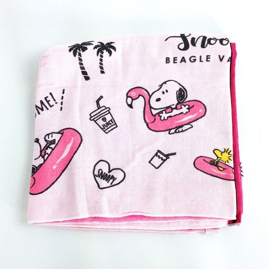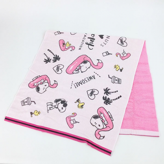 まずはこちら、フラミンゴデザインのスヌーピーのバスタオルです。ピンクがキュートなイメージですね。ハワイアンな感じのするこのデザインは、珍しいですね。肌ざわりももちろん柔らかくて、気持ちいいんです。
