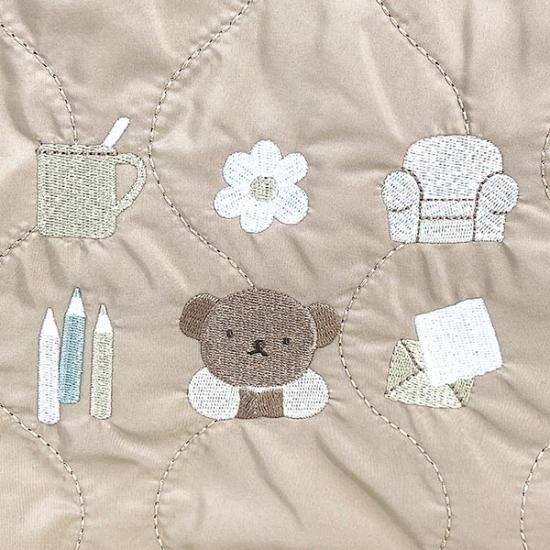 ミッフィーの友達である、少しおっちょこちょいなクマの男の子「ボリス」です。コップやお花、ソファなどの小物がカラフルに刺繍されています。