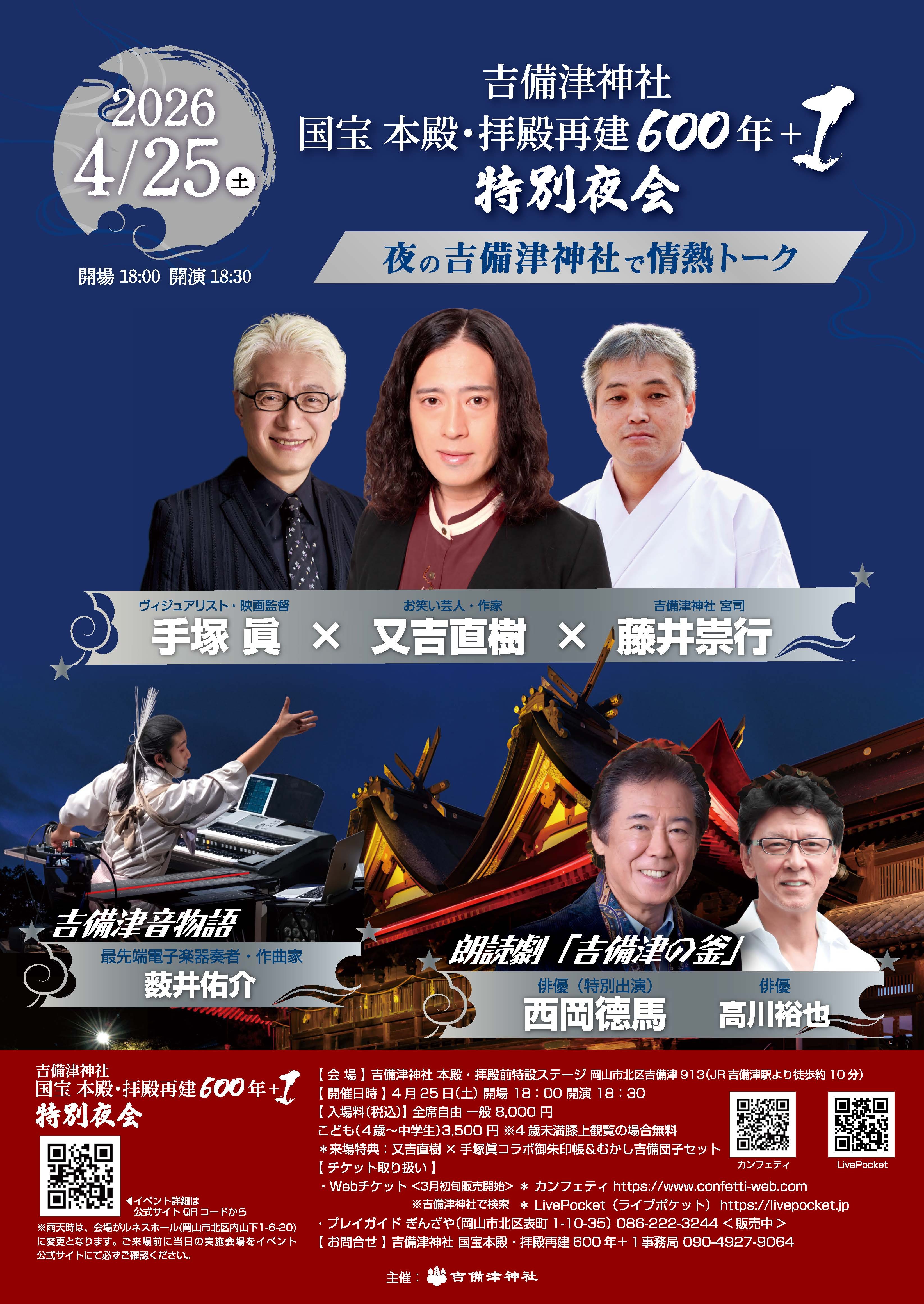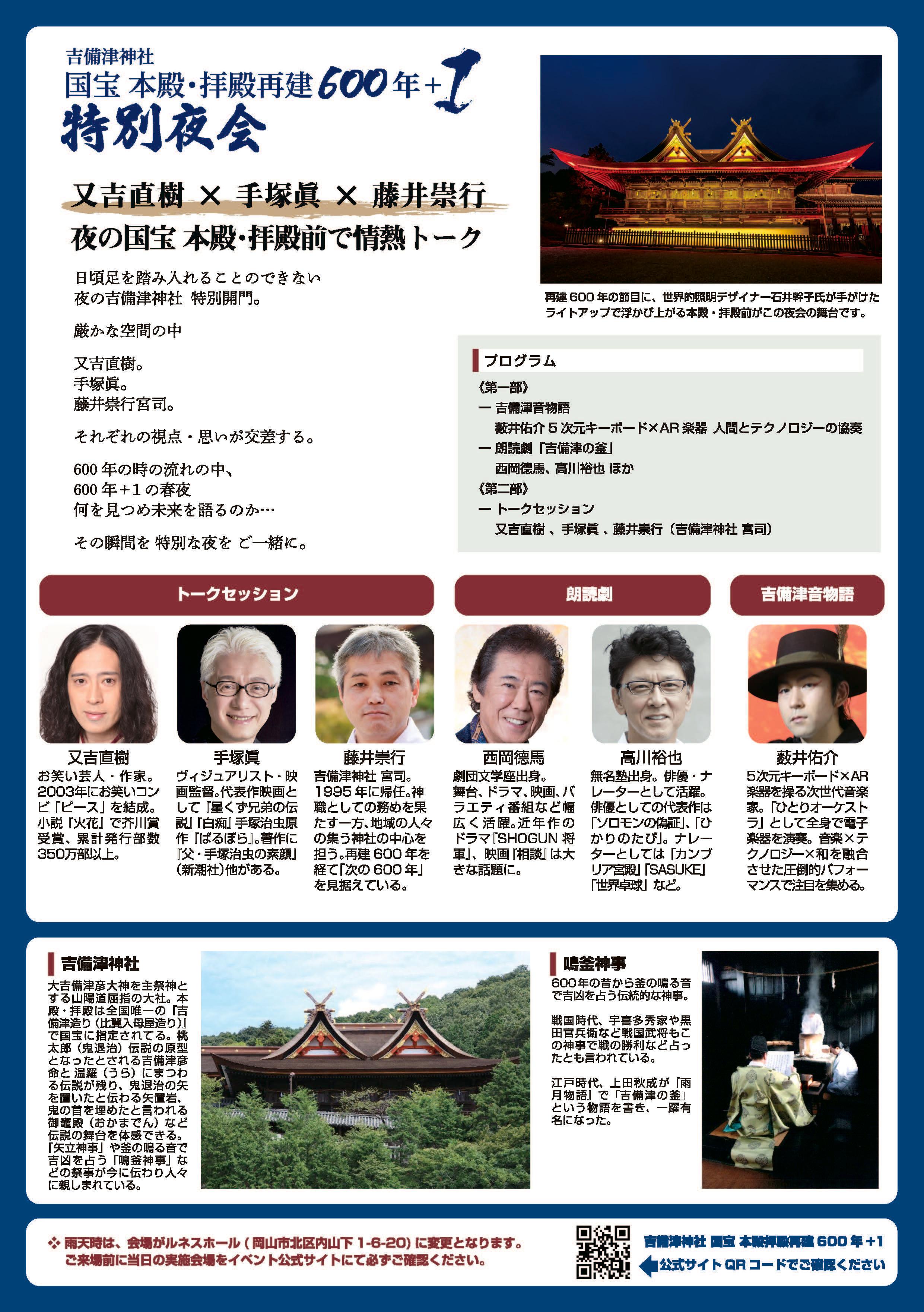 吉備津神社(岡山市北区)は、「国宝 本殿・拝殿再建600年+1」の新たな幕開けを迎え、2026年4月25日(土)に「特別夜会」を開催いたします。本イベントは、通常非公開の夜間に境内を開放した歴史的空間で、トーク・朗読劇・音楽を融合した一夜限りの特別企画です。