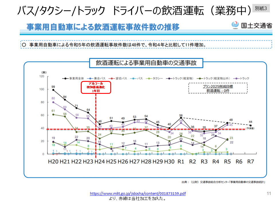 ところが、アルコール検知器義務付けが行われたものの、 翌年以降、例えばトラックについては、ゼロに向かうどころか、半減にすらいたっていません。前年比増という年もみられました(別紙3)。