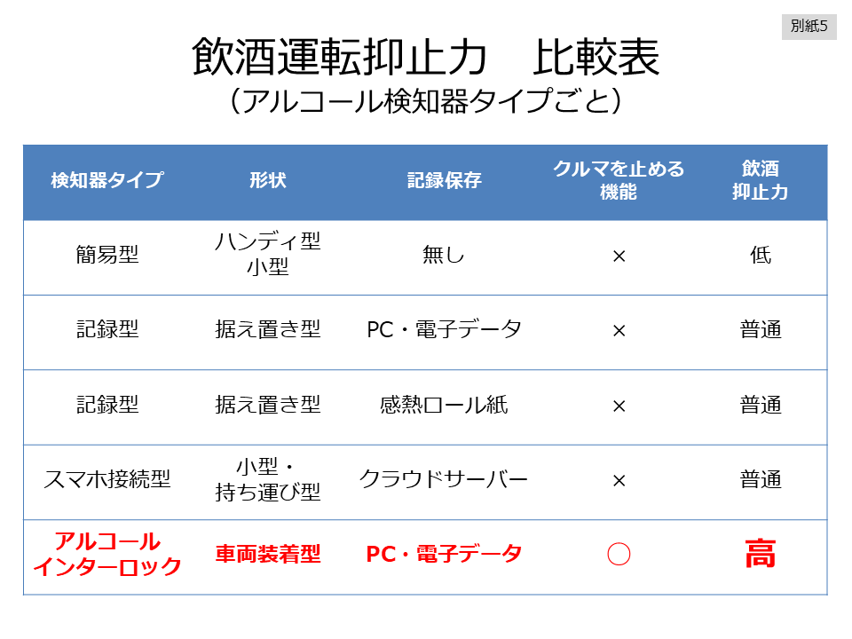 当社は、2009年9月から、運転前に呼気検査を行いアルコールが検知されるとエンジンがかからない飲酒運転防止システム「呼気吹き込み式アルコール・インターロック」を販売しています。現在、アルコール検知器は多種多様なものがありますが、「運転前に必ず呼気をチェックし記録を残し、検知したらクルマが動かない」、このような強制力のある検知器は、アルコール・インターロック装置だけです(別紙5)。