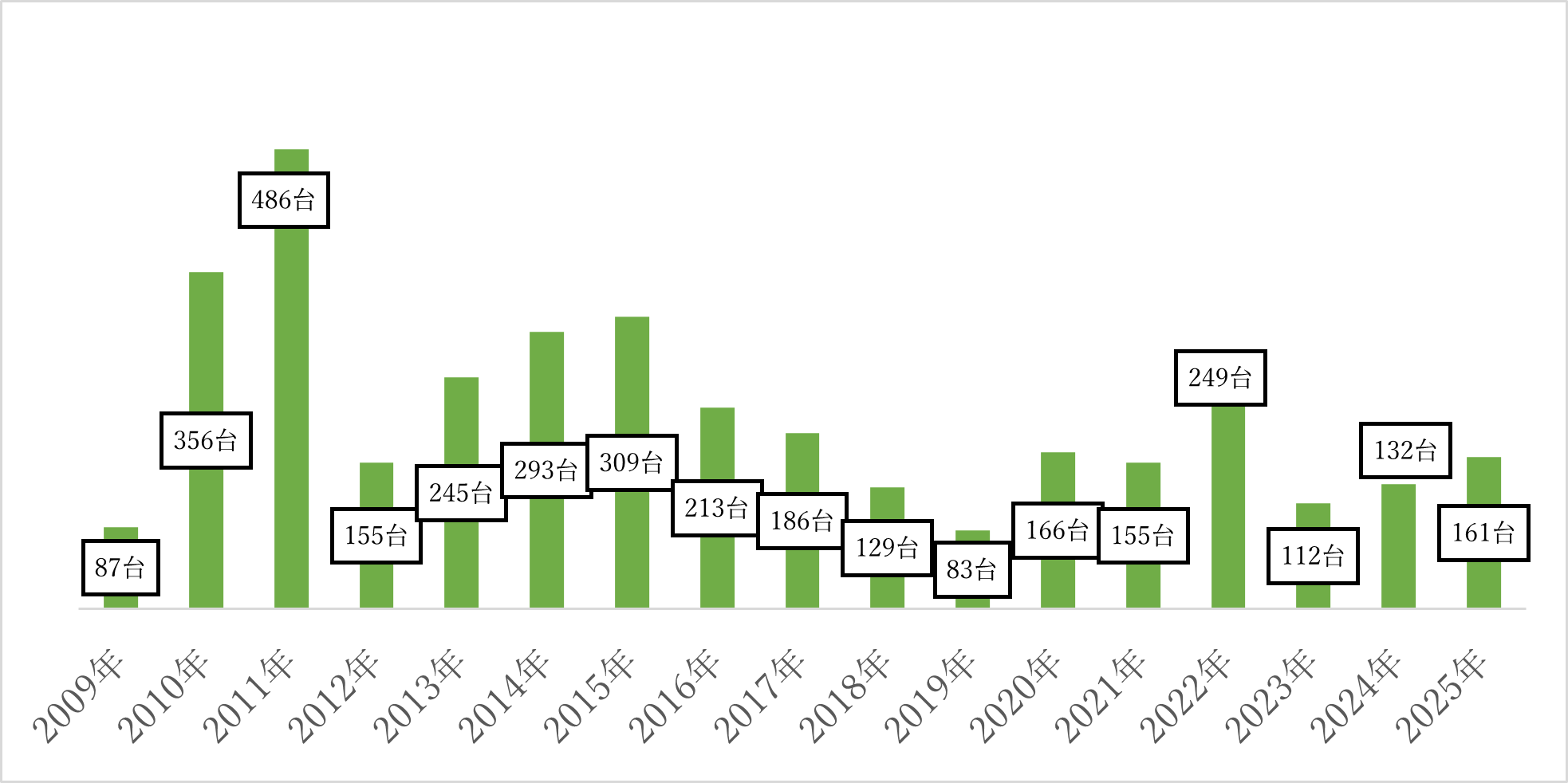 2011年に緑ナンバー、2022年に白ナンバー、ともに事業者へのアルコール検知器使用義務化の影響を受け台数を伸ばした年がありましたが、ここ3年は一定のニーズはありながらも、200台以下とやや低調な実績となっています。本来、「飲酒運転検挙者」向けの機器であるがゆえ、事業者向け市場においては、多彩なアルコール検知器の中でその存在が埋もれている格好と言えます。