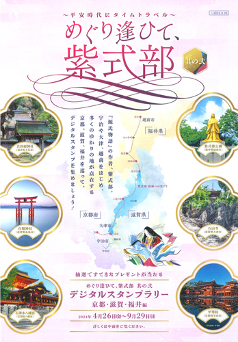 紫式部の軌跡を追いながら、歴史的な背景を掘り下げ、各地の新たな魅力を発見していく取り組みとして、福井県、滋賀県、福井県越前市、滋賀県大津市、京都府宇治市、公益社団法人京都府観光連盟、西日本旅客鉄道株式会社、京阪ホールディングス株式会社、京福電気鉄道株式会社が、2024年4月26日(金)から9月29日(日)まで実施するデジタルスタンプラリー。