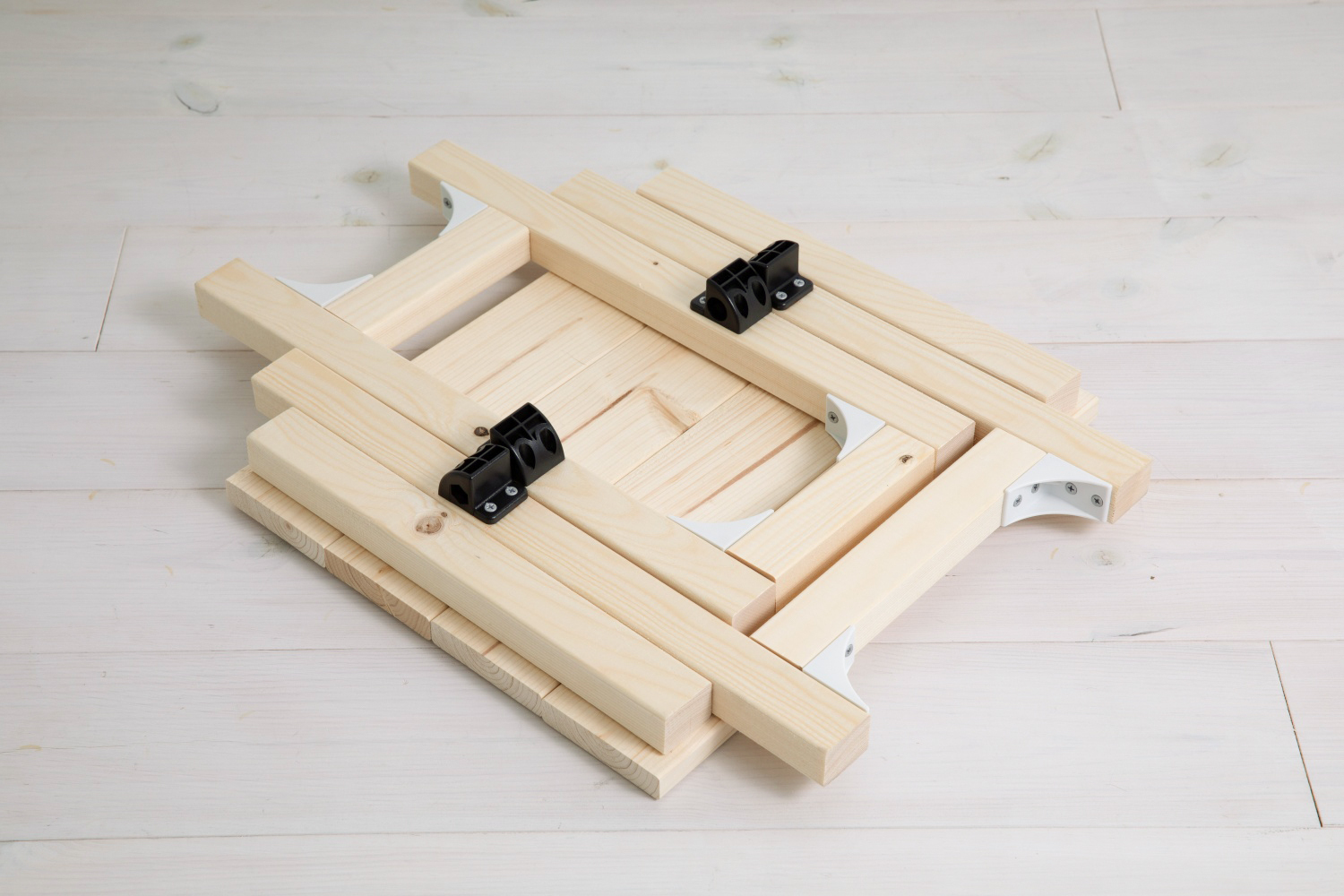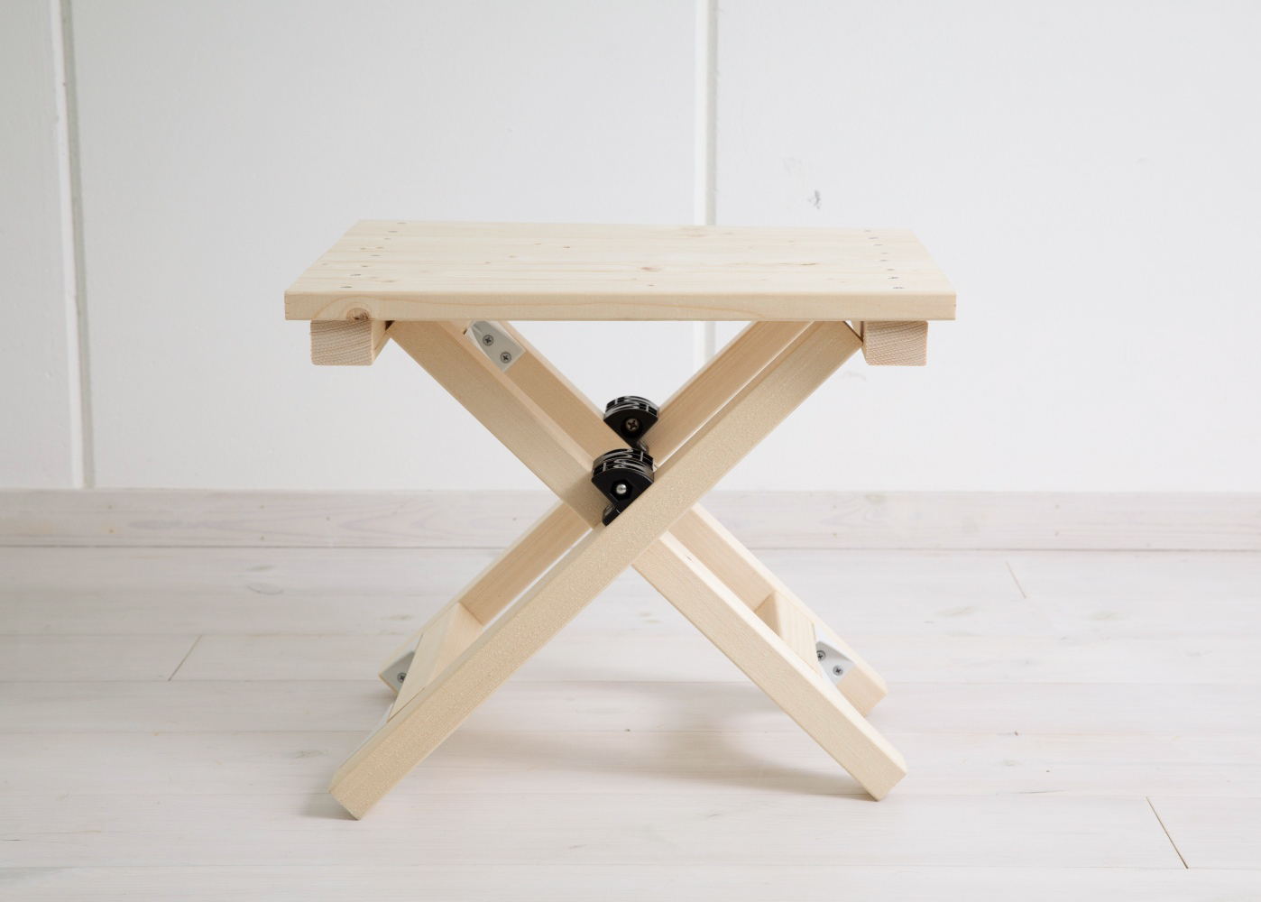 Xジョイントは部材に取り付けるだけで折りたたみ機構になります。穴あけと部材の固定をひとつの工程にまとめることができ、初心者でも簡単に折りたたみ機構のDIYに挑戦できます。カラーはホワイト、ブラックの2色。