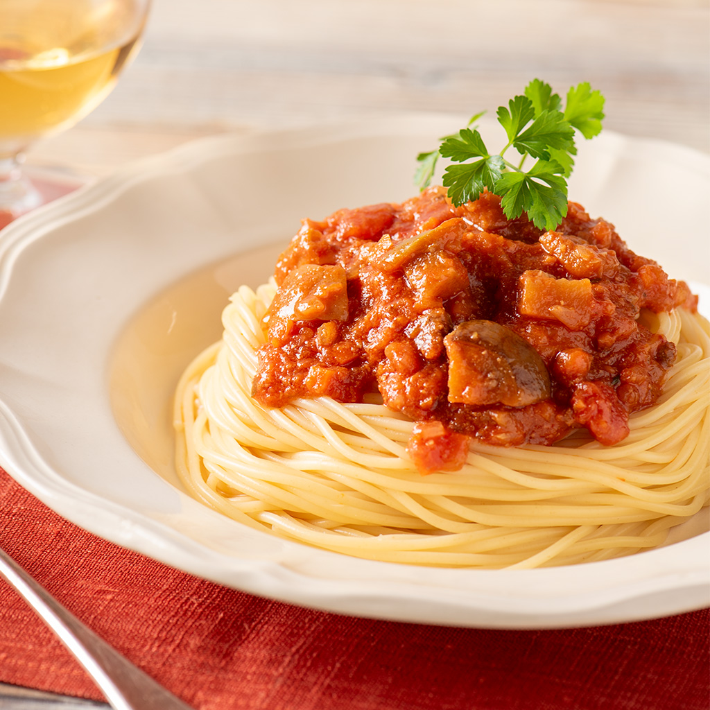 旨みをたっぷりと吸い込んだ揚げ茄子が嬉しい!具材がゴロゴロ入った食べ応えのあるミートソースです。フォンドボーやチーズをベースにしたコク深いトマトソースに、椎茸のだしを加えることで、さらにふくよかで濃厚な味わいに仕上げました。