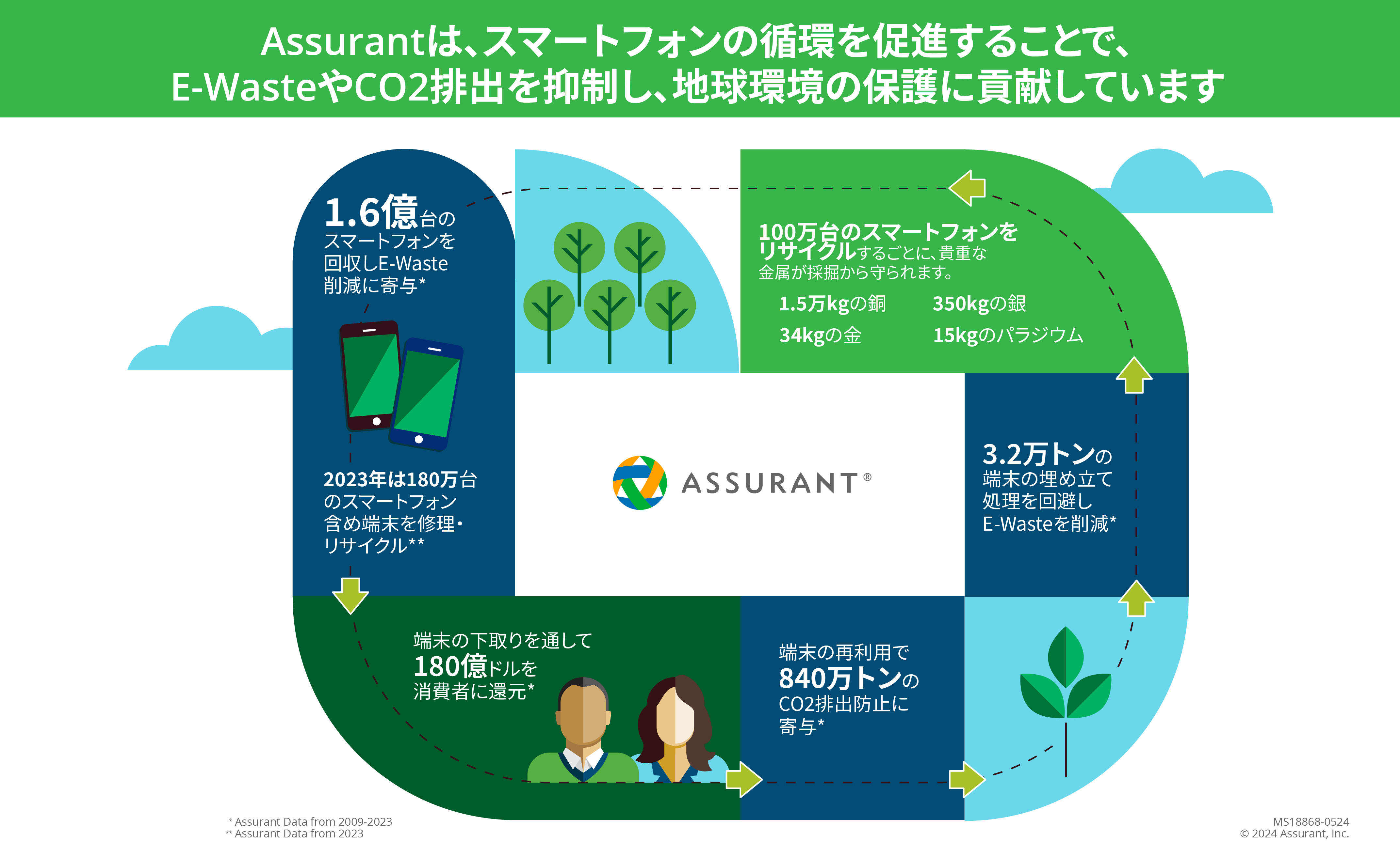 お客様が購入した大切な製品をサポートし、守り、つなぐ革新的なソリューションを提供するビジネスサービス・カンパニーであるAssurant (NYSE:AIZ) は、スマートフォン及び携帯端末の下取り・アップグレード事業のパイオニアであり、グローバル市場におけるマーケットリーダーであることから、使用済みのスマートフォン及び携帯端末を再利用・リサイクルすることが、地球環境の保全や循環型経済への貢献になることを具体的な数値によって周知しています。今回、2009年からの累計で1億6千万台の使用済みスマートフォン及び携帯端末を再利用・リサイクルへと転換し、840万トンのCO2排出を抑制、また3万2千トンのE-waste(電子廃棄物)の排出を抑制したことを発表しました。