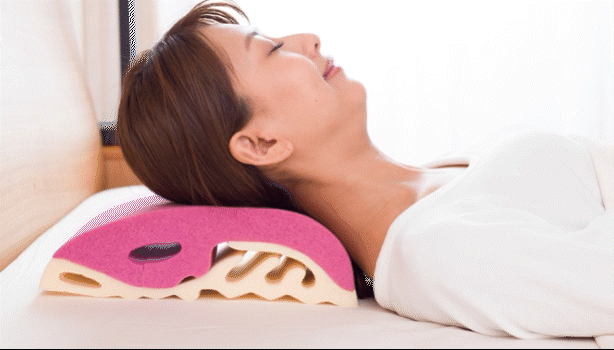 首の湾曲を保ちながら、頭部の沈み込みを調整するので、顎が下がりすぎて息苦しさを感じることもなく適正な寝姿勢を保ちます。