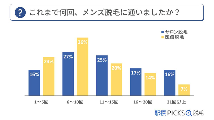 その結果、サロン脱毛は11回以上通っている人が半数以上。一方で医療脱毛は通っている回数が10回以下の人が半数以上という結果に。