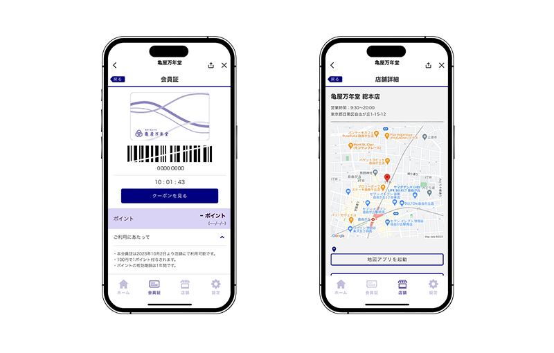 LINEミニアプリ『亀屋万年堂』は、『LINE』のユーザーであればQRコードやURLを通じてアクセスし、新規にアプリをダウンロードすることなく『LINE』上で、簡単に会員登録できます。会員登録が完了すると画面上に会員証が発行され、当日のお会計のポイントを貯めてお帰りいただけます。お会計金額100円ごとに1ポイントが付与され、画面上を指でこすって抽選するスクラッチ機能でもポイントを獲得できます(スクラッチは毎月20日実施予定)。貯まったポイントは1ポイント=1円として次回以降利用できます。従来のスタンプカードで貯めたスタンプは2023年10月2日~2024年1月31日までの期間はポイントに換算して移行可能です。