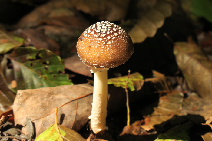 人間が食べると精神錯乱、幻覚などの症状を起こす毒きのこです。白い水玉模様が特徴的で、森の落ち葉の中でもよく目立ちます。