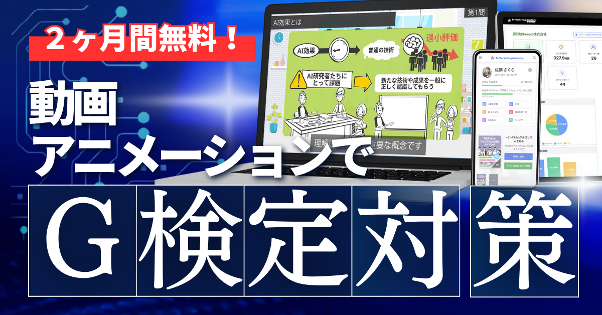 株式会社CARTA HOLDINGSのグループ会社で、企業のデジタルマーケター育成を行う動画eラーニング事業を展開するD-Marketing Academy株式会社(東京都港区、代表取締役:寺田 昇平)は、G検定(ジェネラリスト検定)対策に特化した講座を新たに86本拡充し、個人限定で「2ヶ月間完全無料」で提供いたします。