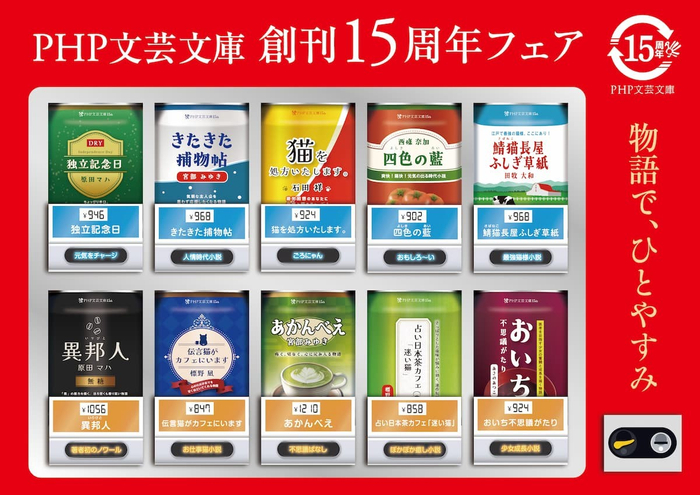 牛乳石鹸ブックカバーなど、読むだけでない「本の楽しみ」を独自に提供している正和堂書店(大阪市鶴見区・代表取締役 宮西正典)が、15周年を迎えるPHP文芸文庫の中から選りすぐった小説10作品のために、缶飲料をモチーフにしたフルカバー帯を特別にデザインしました。ほろ苦いコーヒーや刺激的な炭酸、やさしい甘さのミルクティーなどの「缶」には、それぞれの作品の「味わい」や「感動」が詰まっています。2025年9月下旬より、この「缶飲料」デザイン帯に衣替えした既刊10作品が、全国の書店に並びます。キャッチコピーは「物語で、ひとやすみ」。休憩時間に、自動販売機の飲み物を選ぶような感覚で楽しめる特別なフェアです。