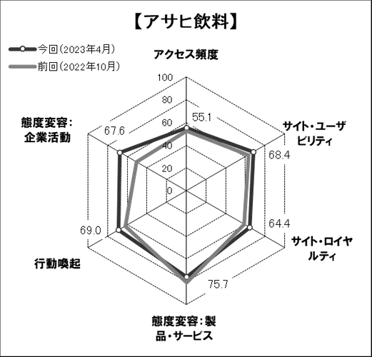 「アサヒ飲料」は、一般企業サイト内順位が前回第17位から上昇し、初の首位を獲得した。500サイトでの全体順位は第6位となった。WBIは前回のスコアから8.0ポイント増の74.6ポイントだった(図表2)。個別の指標では、「態度変容:企業活動」が16.9ポイント増と大幅に上昇し、67.6ポイントの高評価を獲得した(図表3)。トップページのリニューアルに伴い、キービジュアルで「100年のワクワクと笑顔を。」というメッセージを押し出したり、商品情報だけでなく、CSV(Creating Shared Value:共有価値の創造)の取り組みを伝えるコンテンツへの導線を拡充したりするなど、企業としての姿勢や活動が伝わる情報発信が評価の上昇につながった。