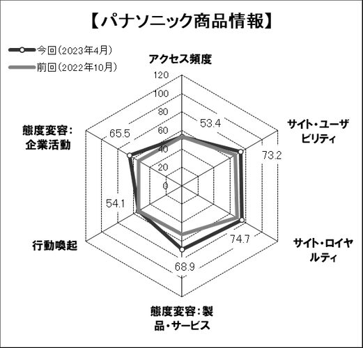第2位の「パナソニック商品情報」は、500サイトの全体順位で前回第50位から第8位に順位を上げた。WBIは、前回から9.9ポイント増の72.0ポイントとなった(図表2)。個別の指標のうち、「態度変容:製品・サービス」が前回から15.9ポイント増の68.9ポイント、「態度変容:企業活動」は11.8ポイント増の65.5ポイントとなった(図表4)。製品・サービス、企業活動訴求がともに高い評価を獲得し、WBIの上昇に寄与した。