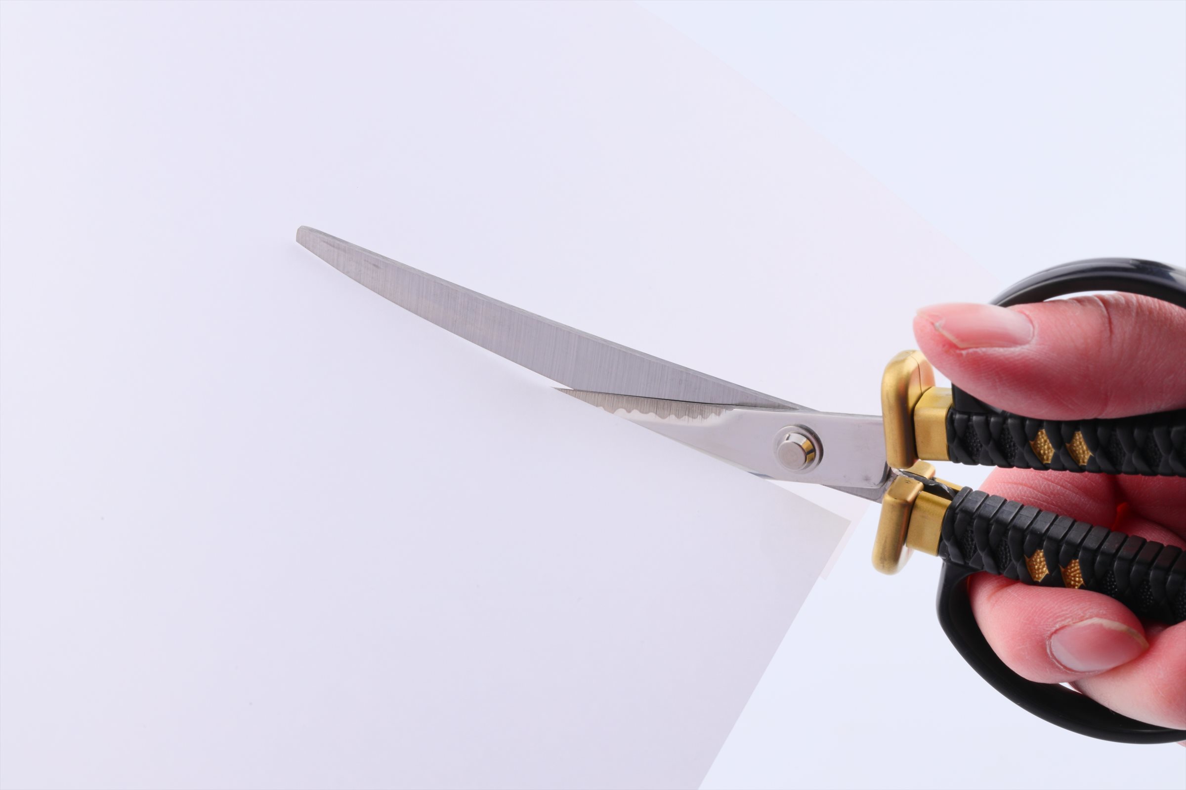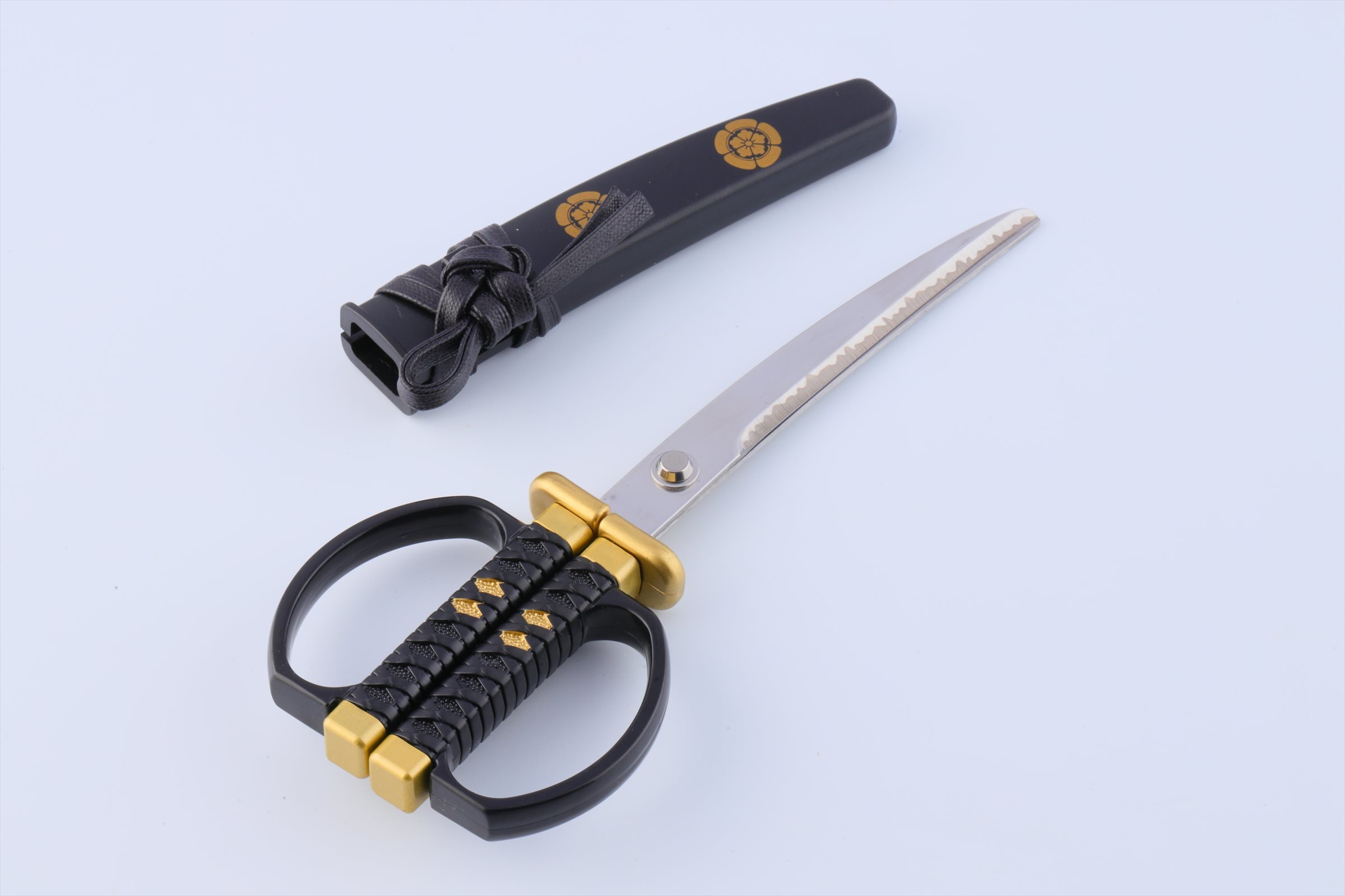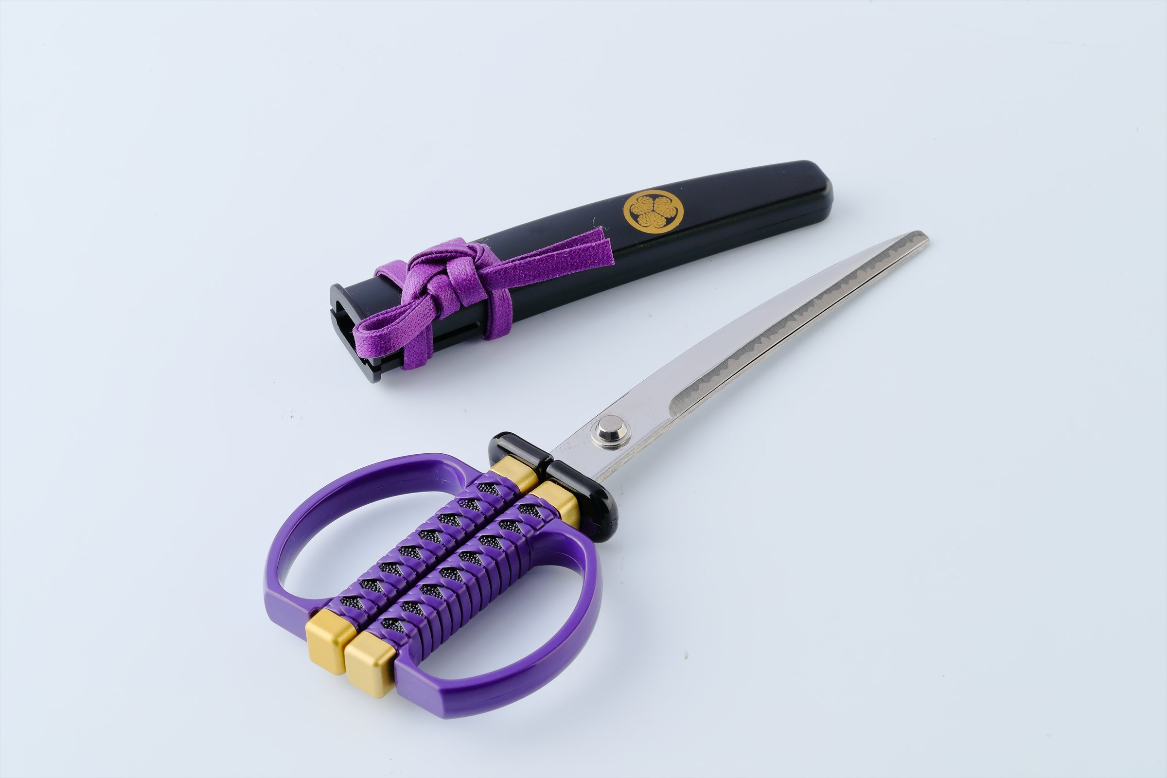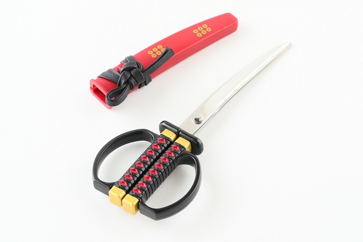 商品の特徴としては、はさみの形状は残しつつも日本刀のような装いで、刃体の沿りや刃紋にこだわっている事、人気武将の家紋をあしらっている事、また、はさみとして使わない時でも飾って楽しめる掛け台付きである事です。更に、岐阜県関市の刃物職人が1本1本丁寧に刃付けをしているため、見た目だけでなく、切れ味も鋭くなっております。