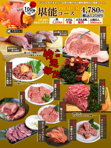 火の蔵厳選の熟成アンガス牛が中心の食べ放題コース!