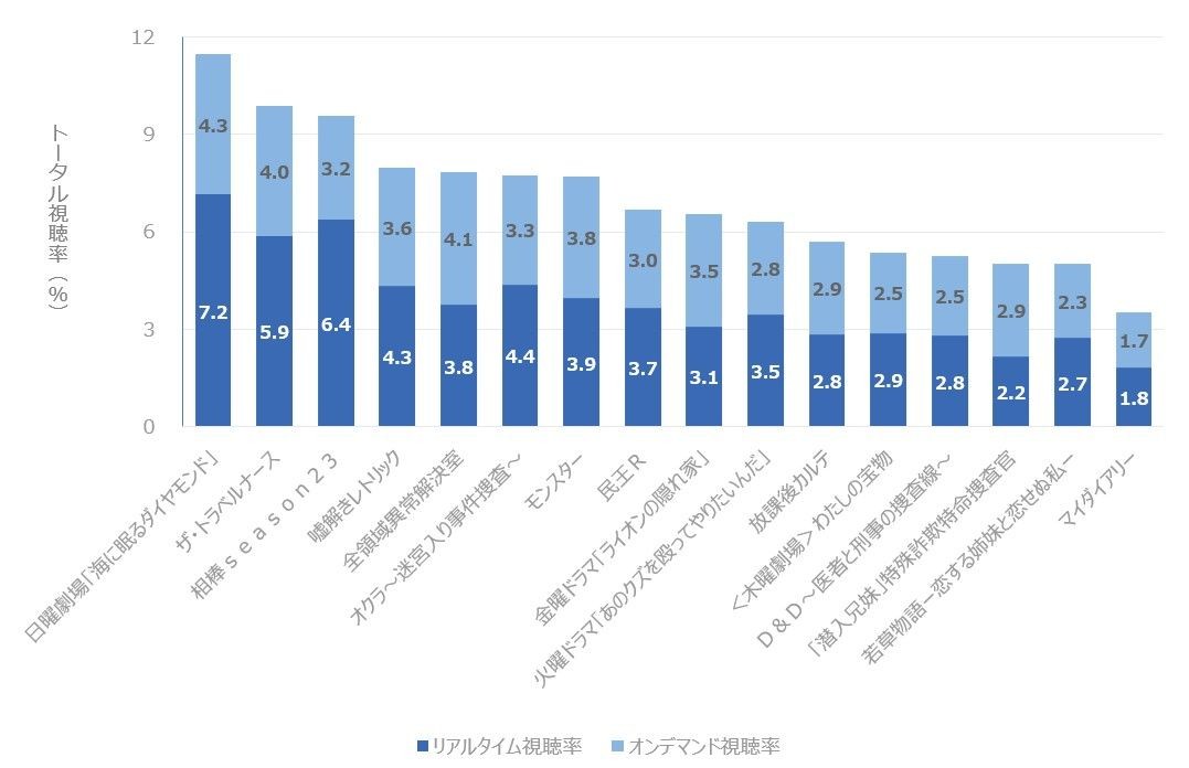 リアルタイム視聴、オンデマンド視聴共に「海に眠るダイヤモンド」(リアルタイム7.2%、オンデマンド4.3%)が最も高い視聴率を記録しました。一人二役を演じる神木隆之介の演技も好評なようです。