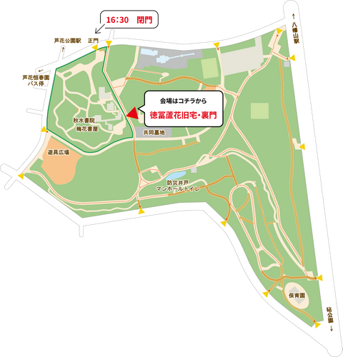 ※16:30以降は、恒春園区域(サービスセンター・蘆花記念館・徳冨蘆花旧宅・愛子夫人居宅を含む)の正門が閉じるため、「徳冨蘆花旧宅前の裏門」からお入りください。